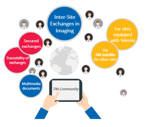 TM-Community est une solution basée sur le cloud qui permet aux établissements hospitaliers d'échanger des dossiers médicaux entre eux. Ces échanges portent sur tous les types de documents (PDF, DICOM, JPEG, etc.) et sont sécurisés et traçables. Cette solution permet notamment de solliciter des deuxièmes avis diagnostiques, d'envoyer un dossier à un centre d'expertise ou de transmettre quotidiennement des images à un centre de référence.